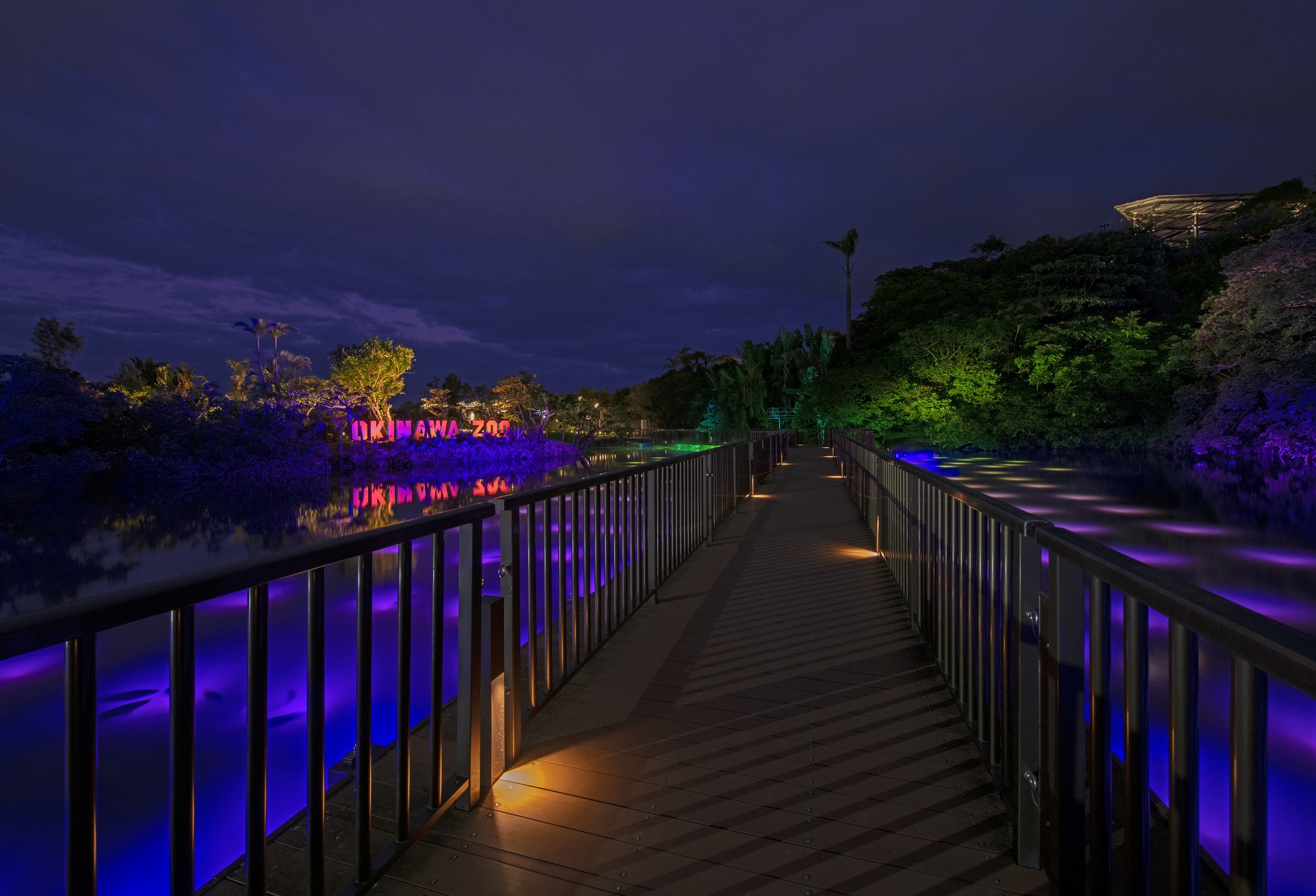 水上園路の周辺には水中フルカラーLED照明を設置、水面のゆらぎが照らし出され、自在に変化する色彩や動きのパターンが歩行空間を楽しく演出している。
