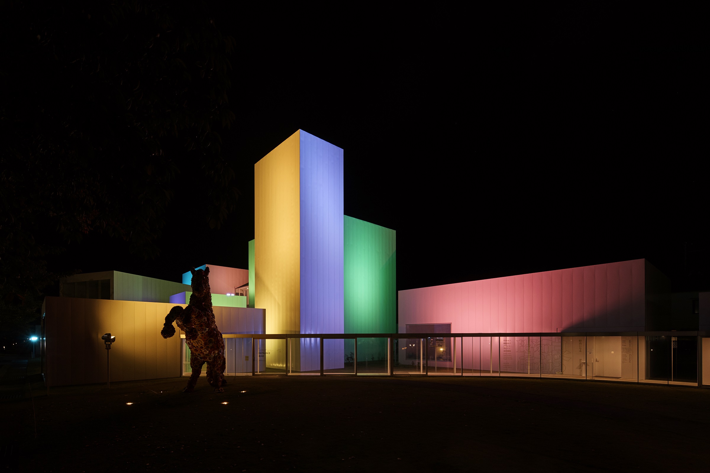 2008年より十和田市現代美術館に常設されている美術家・高橋匡太の作品は、複数の立方体で構成される十和田市現代美術館の外観を光によって再構築する。