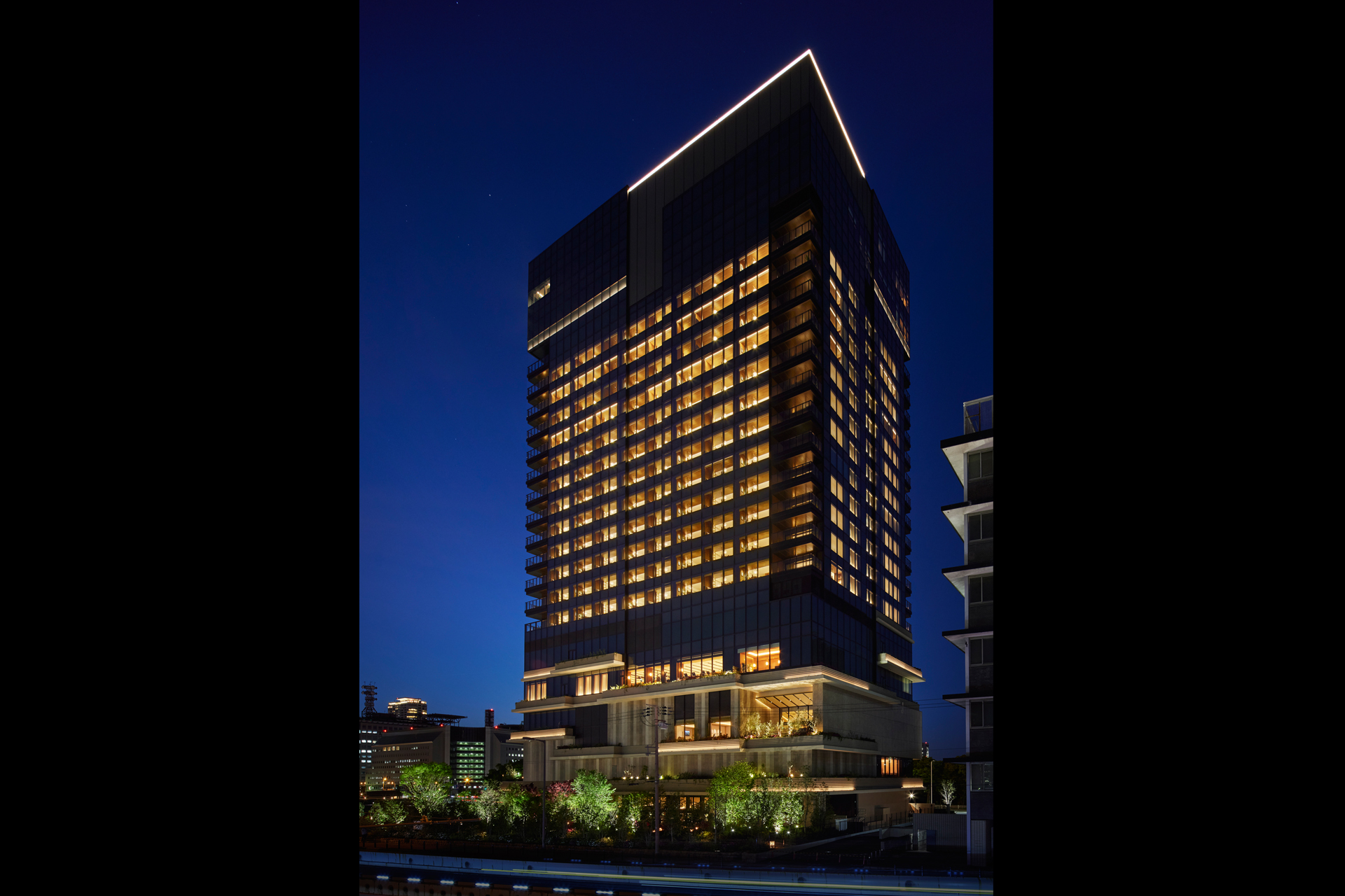 低層部では建築デザインの横ルーバーを強調し、高層部では夜間のスカイラインを形成。